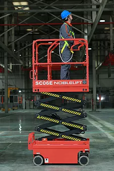 Серия сверхкомпактных ножничных подъемников SC06E с DC-двигателем хода разработана для работы в помещениях с ограниченным пространством, например, в лифтах.