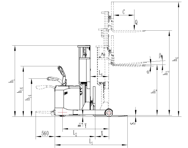 Высота свободного подъема h2 (мм) Габаритная высота мачты минимальная h1 (мм) Высота вил максимальная h3 + h13 (мм) Габаритная высота мачты максимальная h4 (мм)