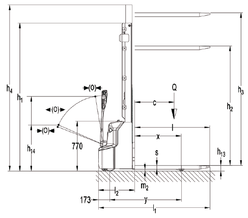 Высота подъема h3 (мм) Высота свободного подъема h2 (мм) Габаритная высота мачты минимальная h1 (мм) Высота вил максимальная h3 + h13 (мм) Габаритная высота мачты максимальная h4 (мм)