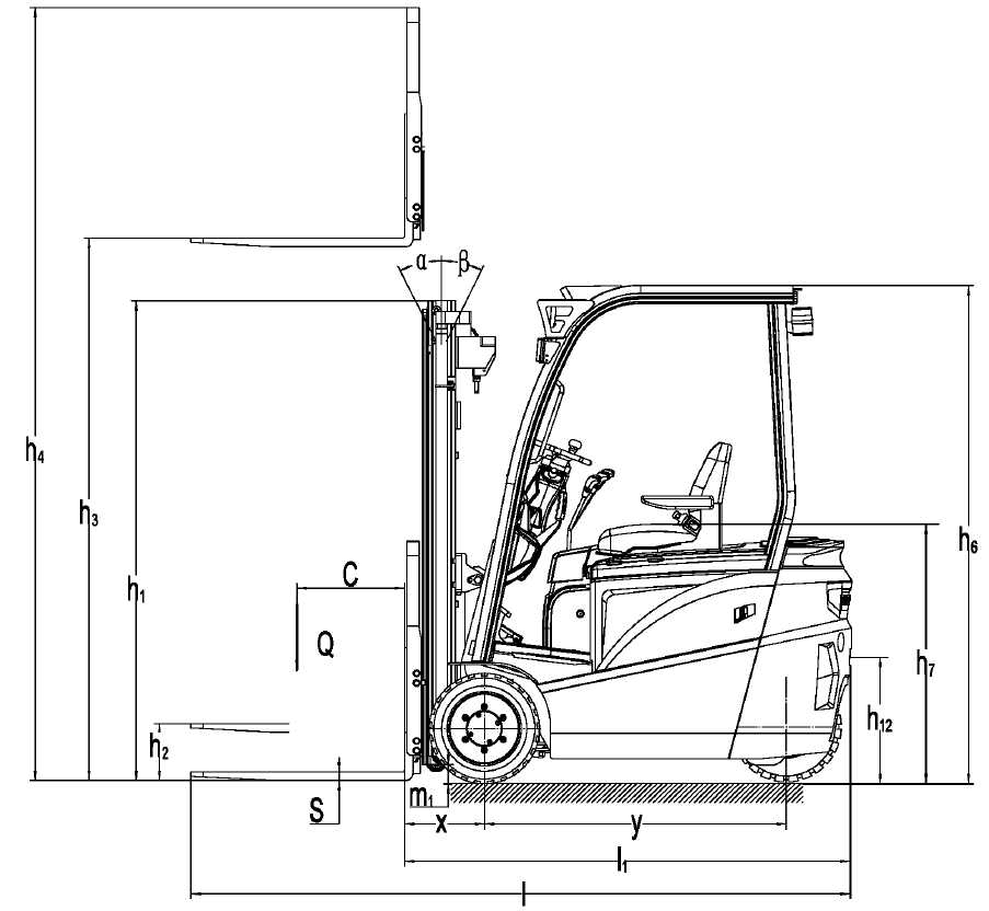 Высота подъема h3 (мм) Высота свободного подъема h2 (мм) Габаритная высота мачты минимальная h1 (мм) Габаритная высота мачты максимальная h4 (мм) Наклон мачты/каретки вил вперед/назад α/β (º) Остаточная грузоподъемность (кг)