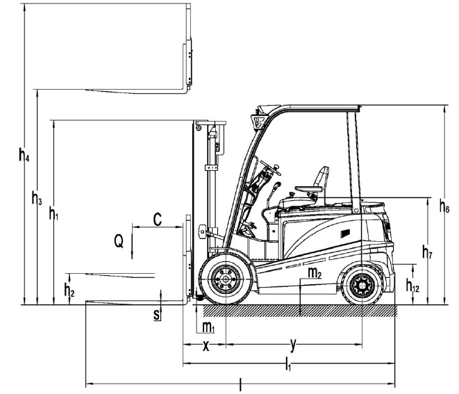 | Высота подъема h3 (мм) | Высота свободного подъема h2 (мм) | Габаритная высота мачты минимальная h1 (мм) | Габаритная высота мачты максимальная h4 (мм) | Наклон мачты/каретки вил вперед/назад α/β (º) | Остаточная грузоподъемность (кг) | |