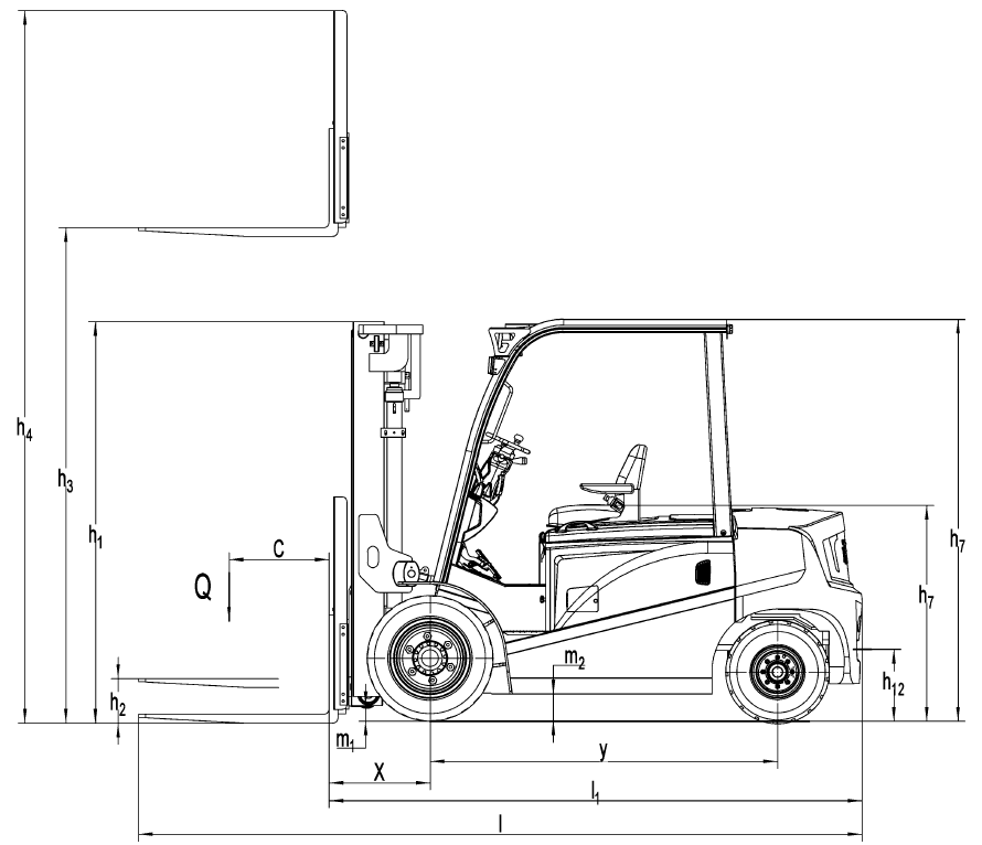 | Высота подъема h3 (мм) | Высота свободного подъема h2 (мм) | Габаритная высота мачты минимальная h1 (мм) | Габаритная высота мачты максимальная h4 (мм) | Наклон мачты/каретки вил вперед/назад α/β (º) | Остаточная грузоподъемность (кг) | |