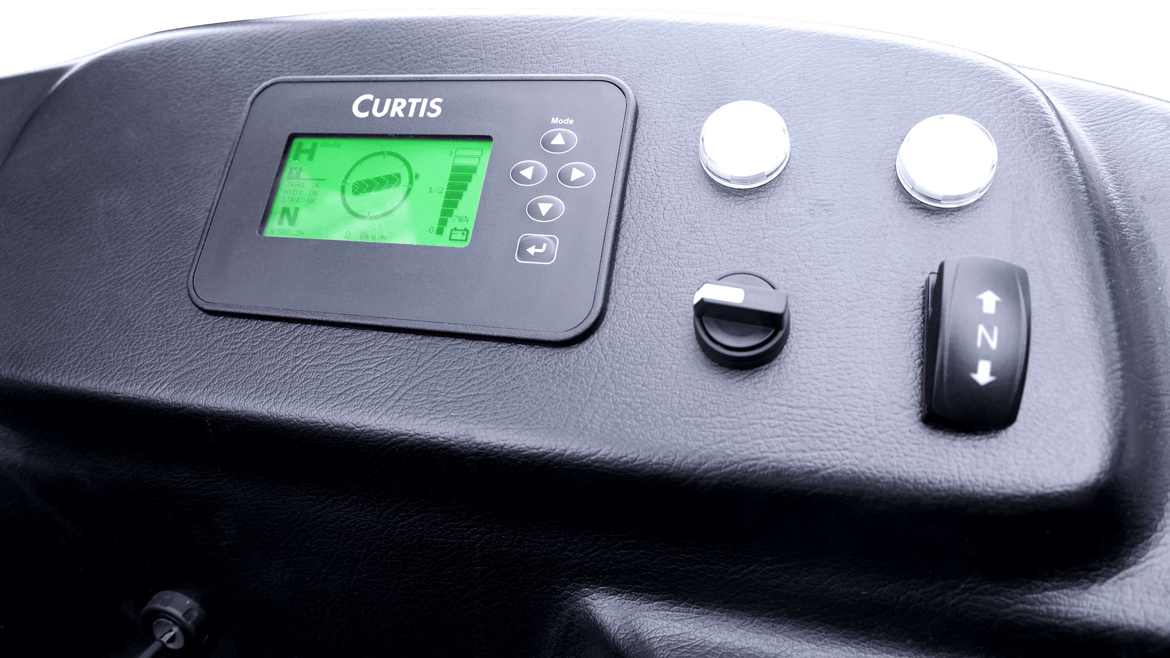• Контроллеры Curtis с информационной панелью, отображающей статус штабелера, положение рулевого колеса, направление движения, время наработки в моточасах и уровень заряда АКБ