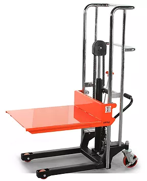Линейка ручных штабелеров с платформой, рассчитанных на грузоподъемность до 400 кг и высоту подъема до 1500 мм.